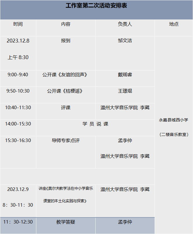 当前位置: 首页 > 孟李仲2023 > 工作室公告 > 关于举行温州市孟李仲中小学音乐“名师送教”工作室第二次活动的通知
