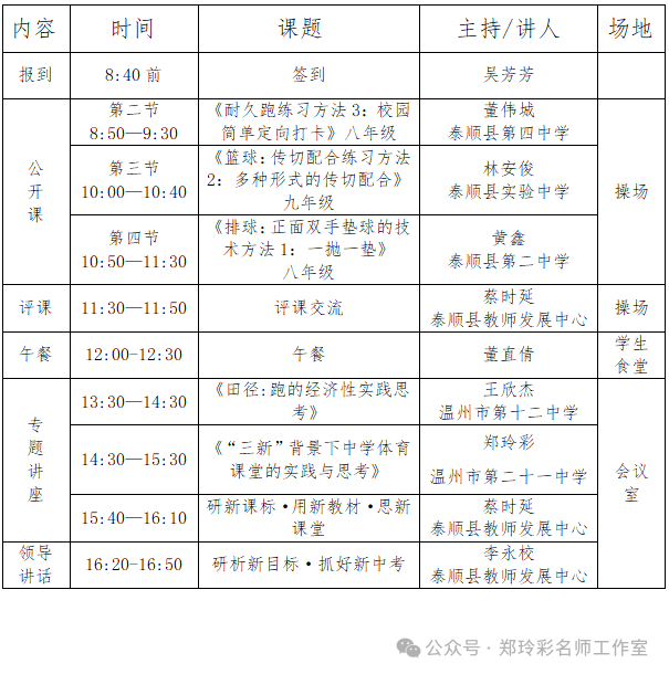 为贯彻落实义教新课标,帮助广大初中教师熟悉新教材,并以新课标新教材的解读学习为契机,探索初中体育课堂教学的研究,提升课堂教学质量,应对体育中考新变化、新要求, 根据温州市郑玲彩“名师送教”工作室”活动计划,现决定举行第12次工作室活动,